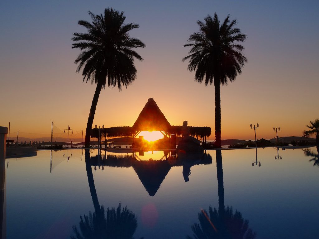 Im Vordergrund ist einer der Pools der Anlage zu sehen, welcher zu dieser Zeit noch unberührt ist. Die Sonne geht in der Hütte am Pool auf, welche durch die Palmen eingerahmt wird und die sich im Wasser des Pools spiegeln. Im Hintergrund ist noch das angrenzende Mehr zu erahnen.